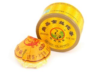 Самая популярная форма прессовки пуэра от завода Сягуань – это точа (чаша, гнездо, купол). Отличается от классических форм, таких как блин или кирпич, своей компактностью. При производстве удобство такой формы не даёт сырью портиться и плесневеть за счёт большой площади контакта с воздухом. Золотая ленточка, запрессованная в пуэре – отличительный знак качества данной марки.