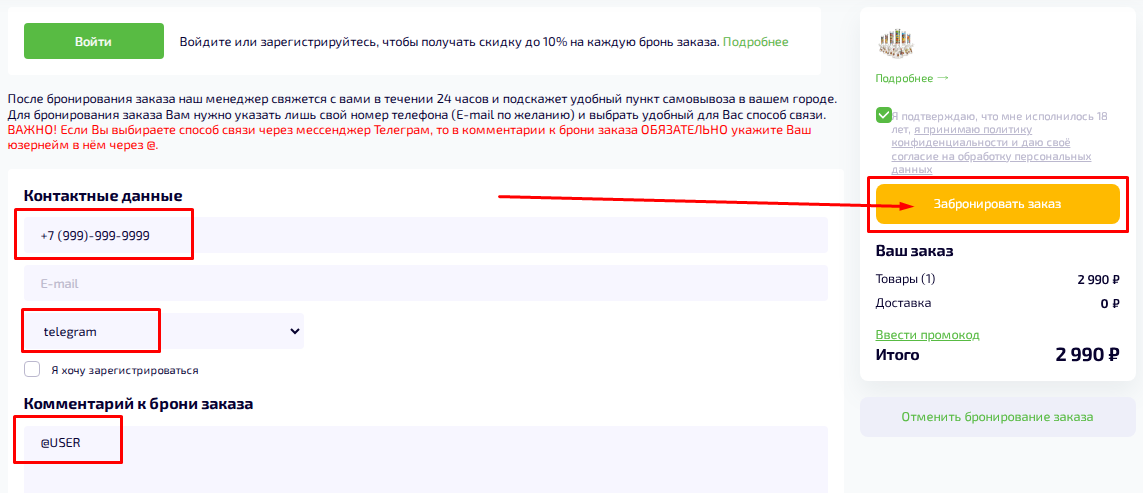 Укажите свой номер телефона, e-mail по желанию и выберете удобный для вас способ связи. ВАЖНО! Если Вы выбираете способ связи через мессенджер Телеграм, то в комментарии к брони заказа ОБЯЗАТЕЛЬНО укажите Ваш юзернейм в нём через @. Введите промокод на скидку если он у вас есть. Далее снова нажмите на кнопку «ЗАБРОНИРОВАТЬ ЗАКАЗ».